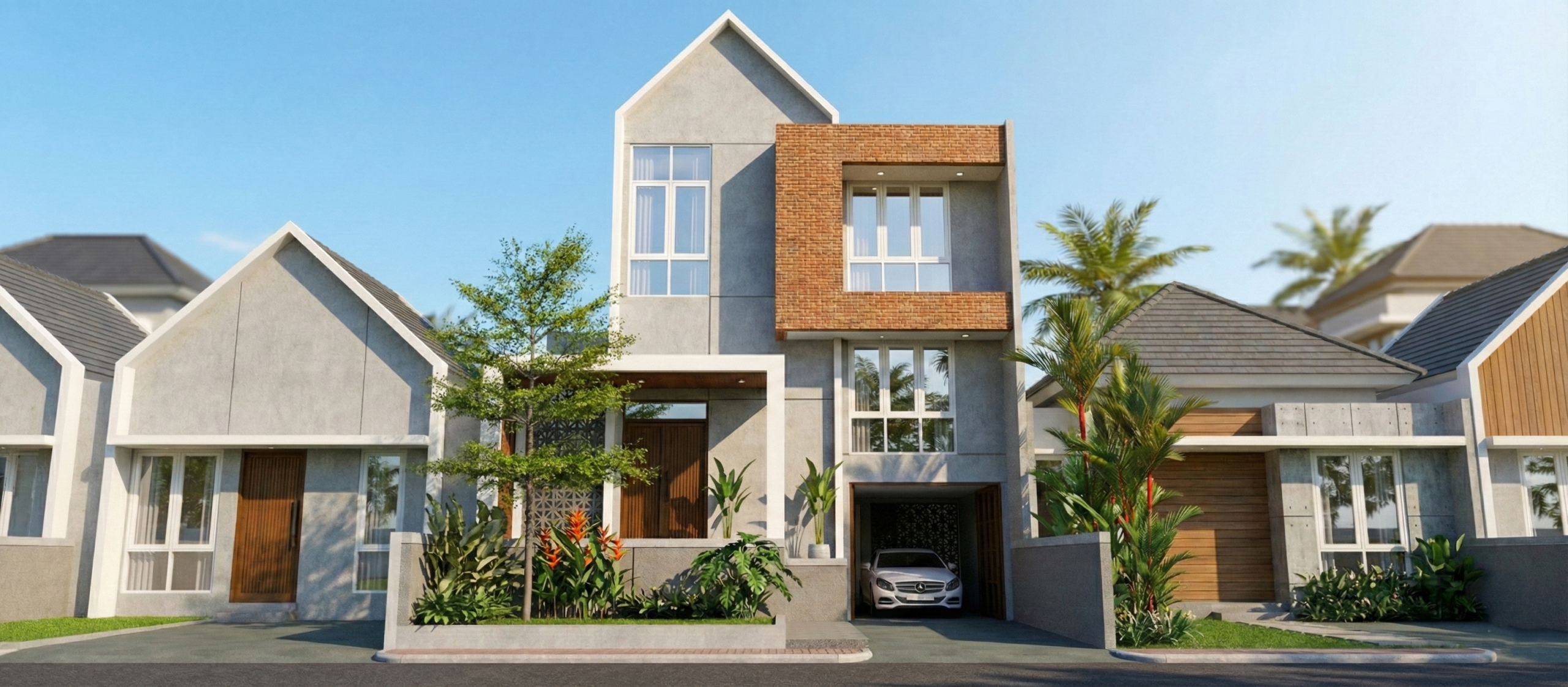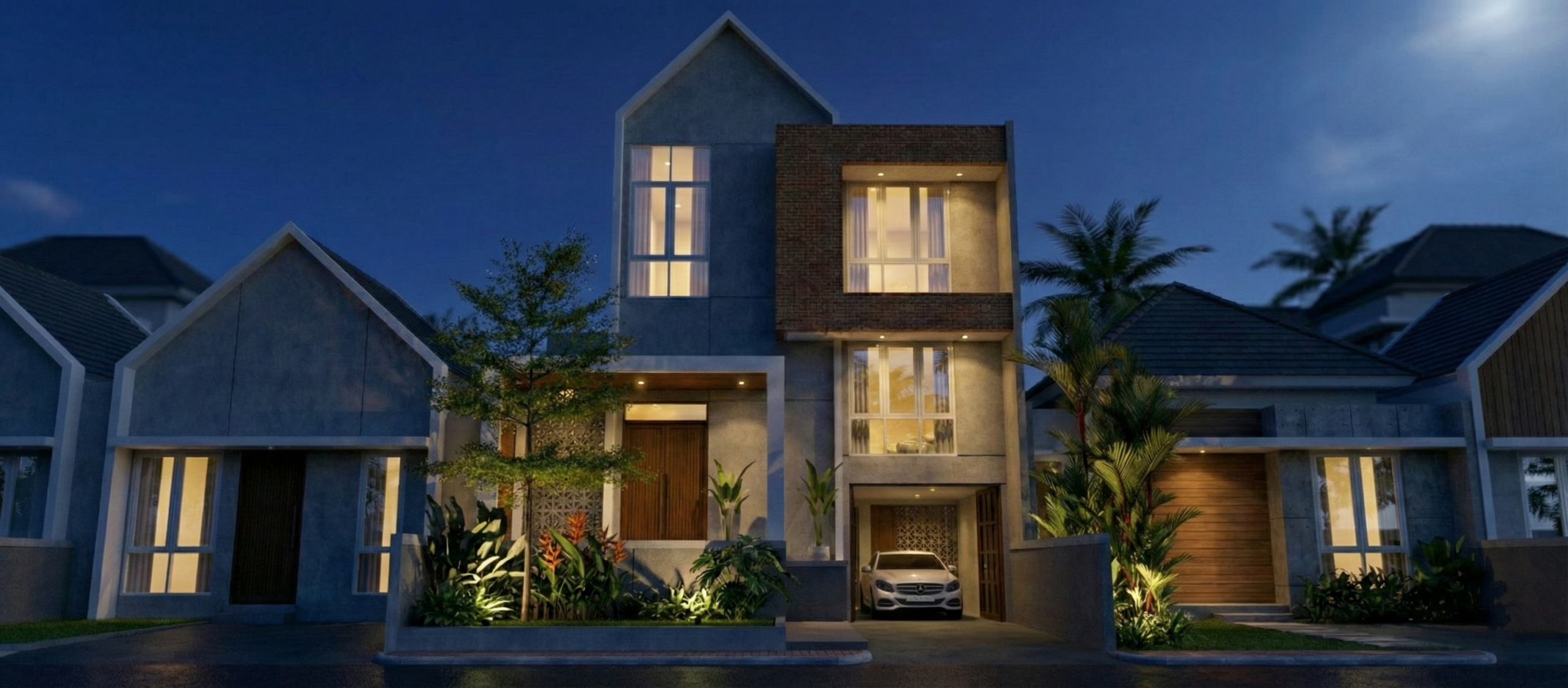 Hunian ini mengusung pendekatan Modern Minimalis dengan komposisi massa vertikal sebagai penegas identitas di tengah lingkungan perumahan. Bentuk atap pelana sederhana dipertahankan sebagai elemen kontekstual, lalu dipadukan dengan permainan bidang kotak pada lantai dua yang dibalut material bata ekspos. Perpaduan ini menciptakan dialog antara bentuk klasik yang familiar dan sentuhan modern yang tegas serta berkarakter.