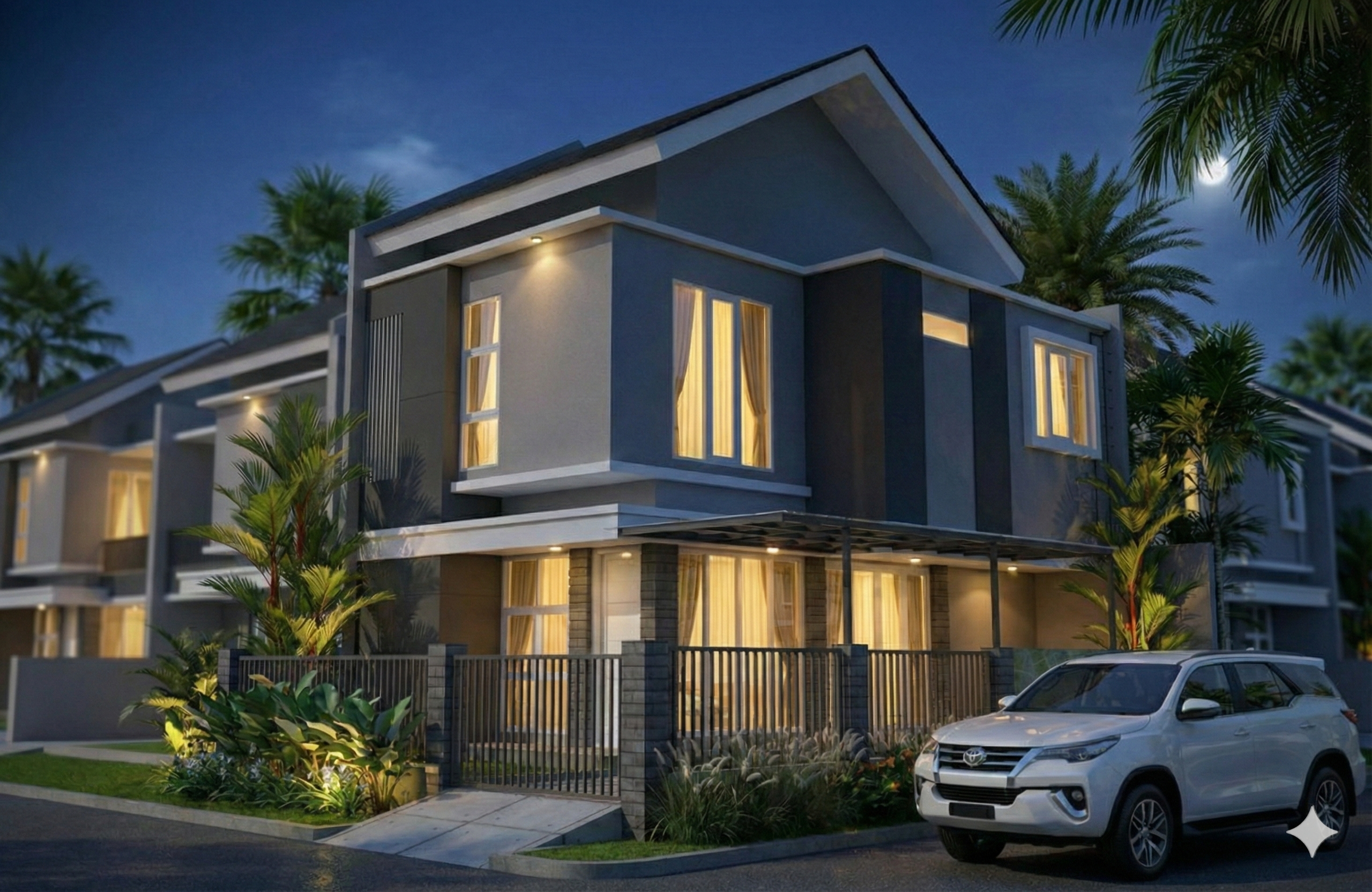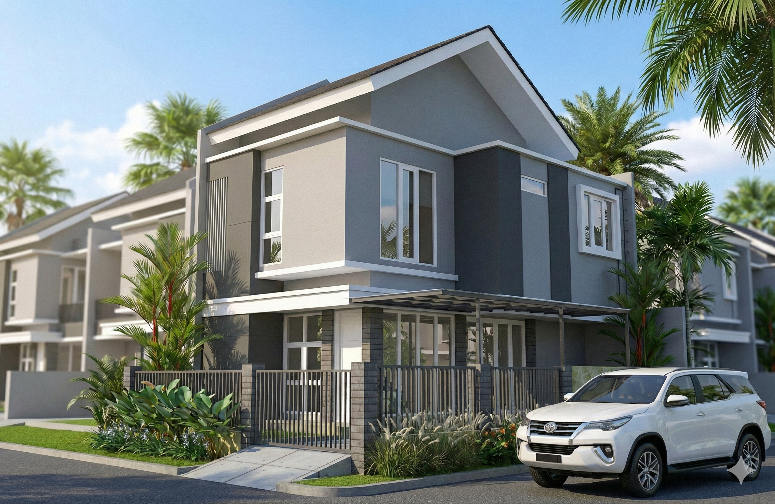 Bukaan jendela yang proporsional memaksimalkan pencahayaan alami dan sirkulasi udara, sementara elemen kanopi dan pagar minimalis mempertegas kesan modern yang fungsional. Lanskap tropis dengan vegetasi rindang menjadi pelengkap yang menyatu dengan arsitektur, menghadirkan suasana hunian yang teduh, nyaman, dan tetap elegan di dalam lingkungan perumahan yang tertata.