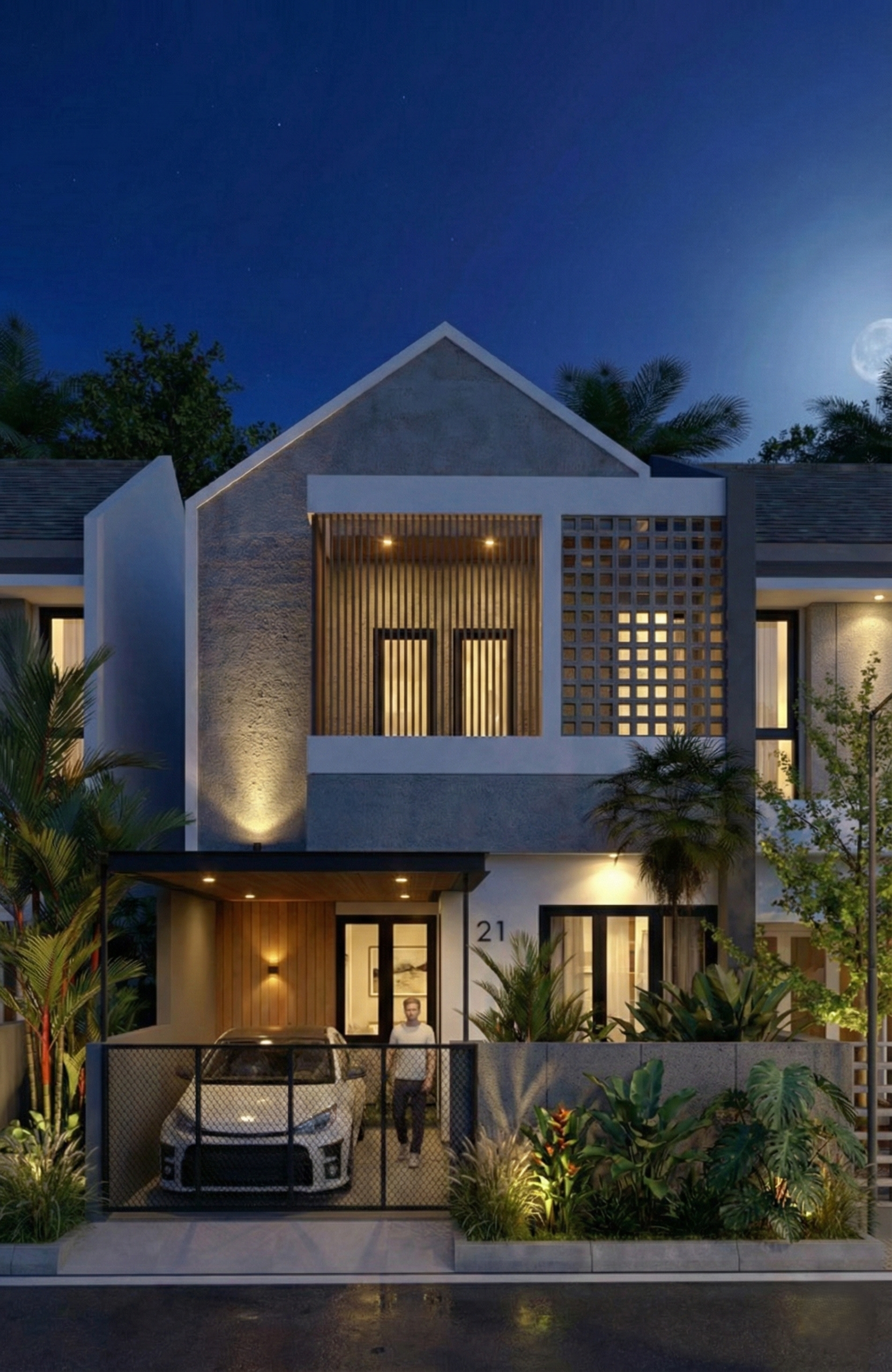 Bangunan hunian ini mengusung konsep Tropis Minimalis yang menekankan kesederhanaan bentuk sekaligus respons terhadap iklim. Fasad dirancang dengan komposisi massa yang tegas, dipadukan dengan material bertekstur natural seperti beton ekspos dan elemen kayu vertikal. Penggunaan roster pada lantai atas berfungsi sebagai filter cahaya dan udara, menciptakan pencahayaan alami yang lembut sekaligus menjaga privasi penghuni.