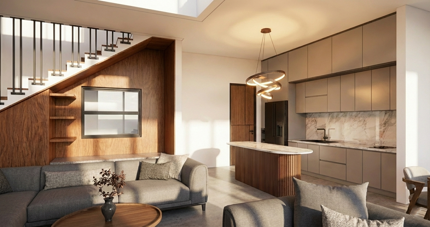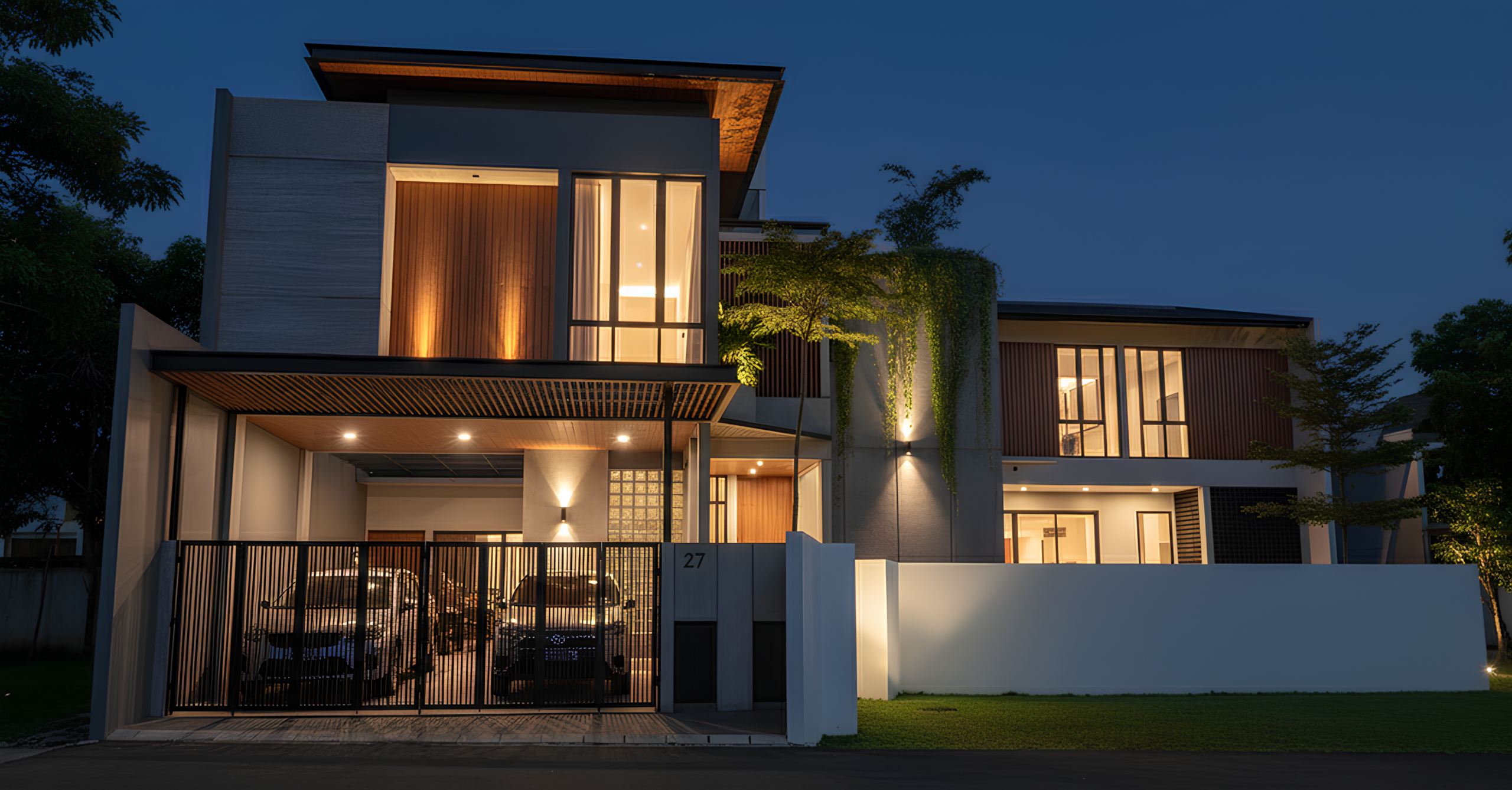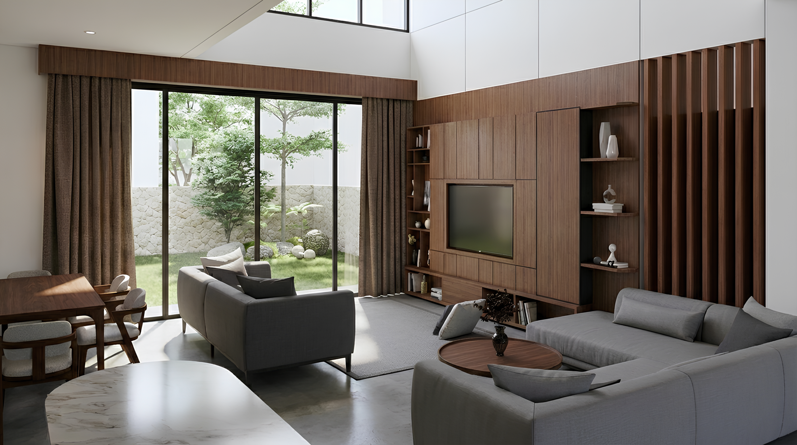 Hunian ini mengusung konsep Tropis Modern yang memadukan ketegasan bentuk geometris dengan kehangatan material alami. Permainan massa bertingkat dengan garis horizontal yang kuat menciptakan komposisi fasad yang dinamis namun tetap seimbang. Material kayu pada secondary skin dan panel dinding menjadi elemen peneduh sekaligus aksen visual yang memperkuat karakter tropis, sementara bukaan kaca berukuran besar menghadirkan koneksi yang intim antara ruang dalam dan lingkungan luar.
