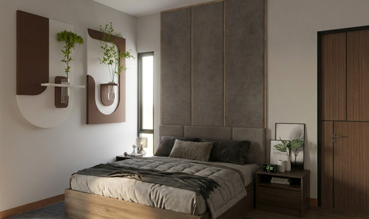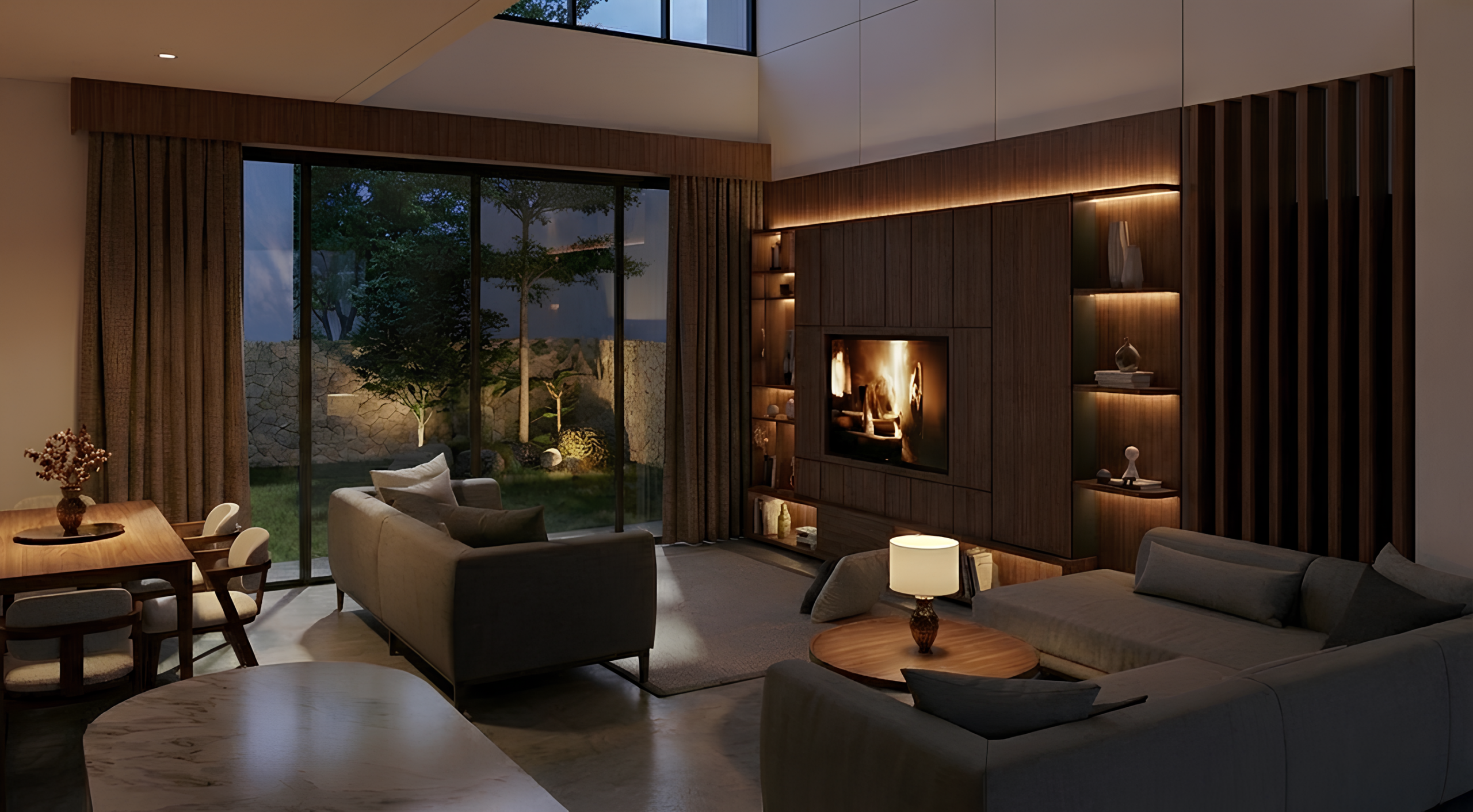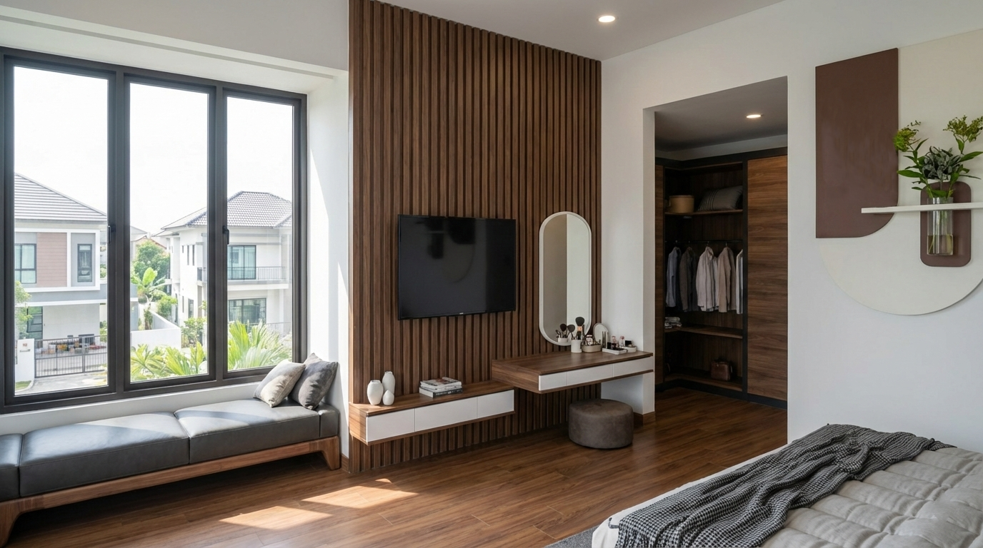 Hunian ini mengusung konsep Tropis Modern yang memadukan ketegasan bentuk geometris dengan kehangatan material alami. Permainan massa bertingkat dengan garis horizontal yang kuat menciptakan komposisi fasad yang dinamis namun tetap seimbang. Material kayu pada secondary skin dan panel dinding menjadi elemen peneduh sekaligus aksen visual yang memperkuat karakter tropis, sementara bukaan kaca berukuran besar menghadirkan koneksi yang intim antara ruang dalam dan lingkungan luar.
