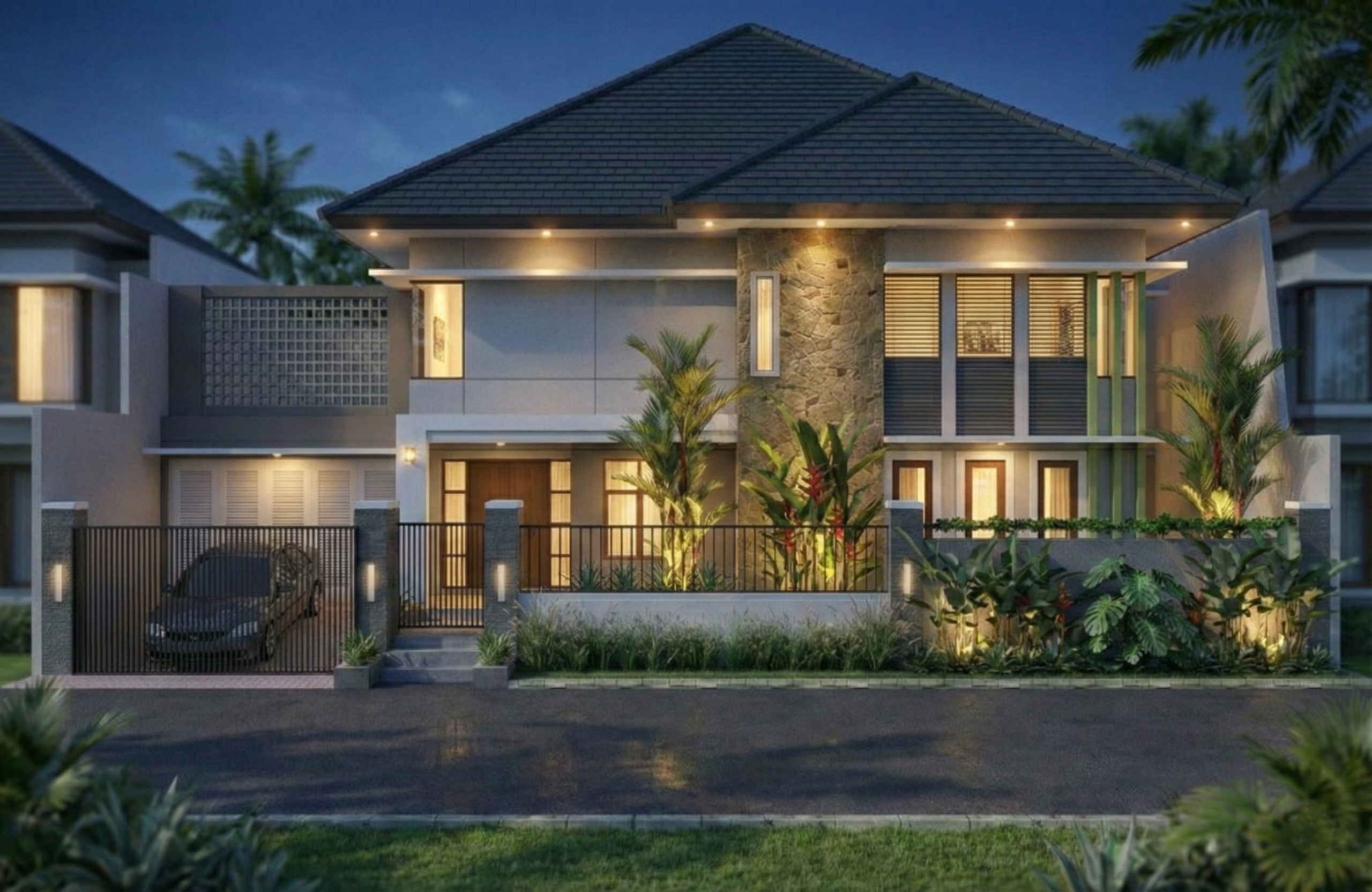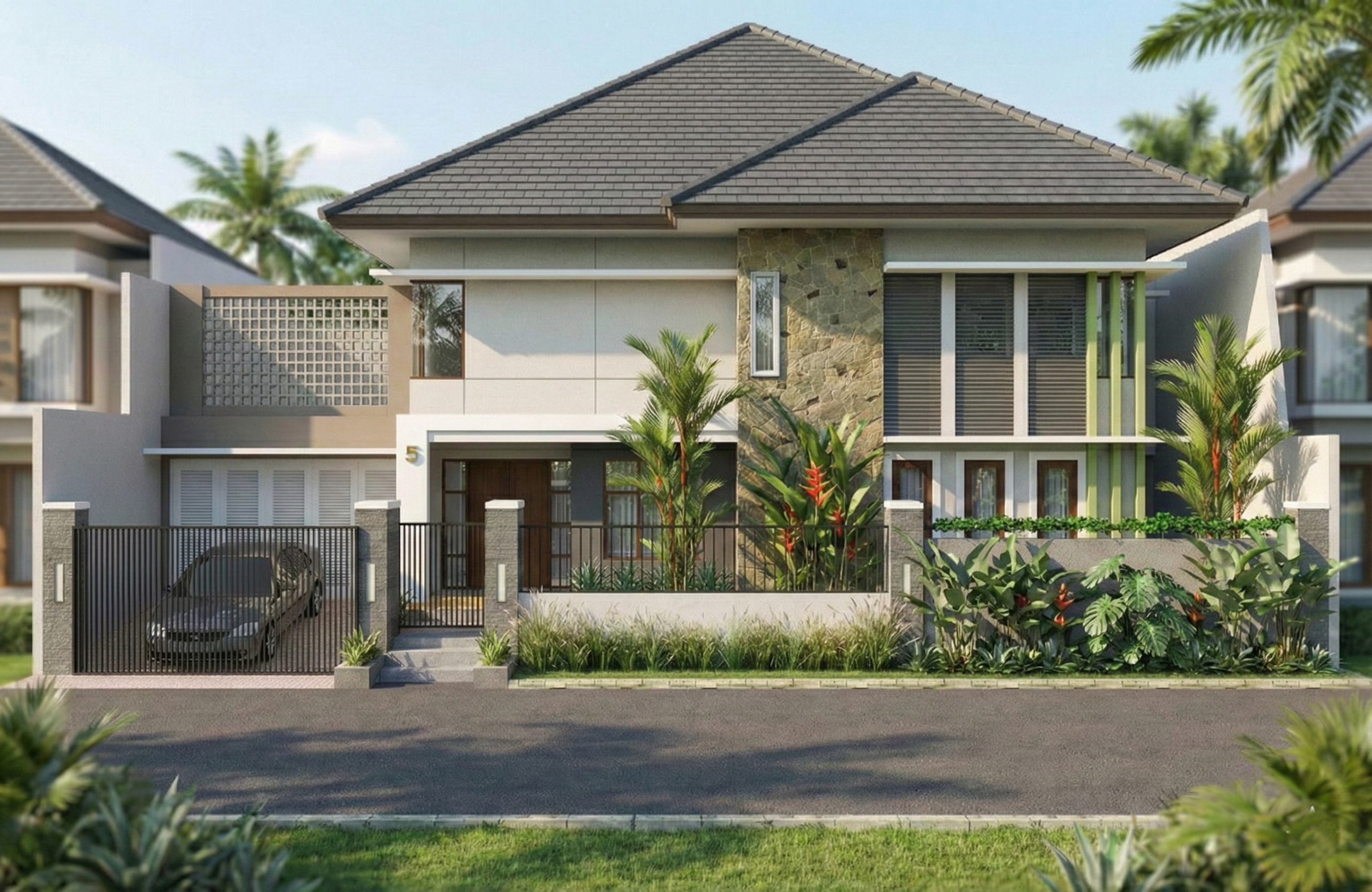 Hunian ini mengusung konsep Tropis Modern. Komposisi massa dua lantai dirancang seimbang dengan permainan bidang horizontal yang bersih, dipadukan aksen batu alam sebagai elemen vertikal penegas karakter. Roster beton pada sisi balkon menjadi elemen fungsional sekaligus estetis, menghadirkan sirkulasi udara alami dan permainan bayangan yang dinamis pada siang hari.
