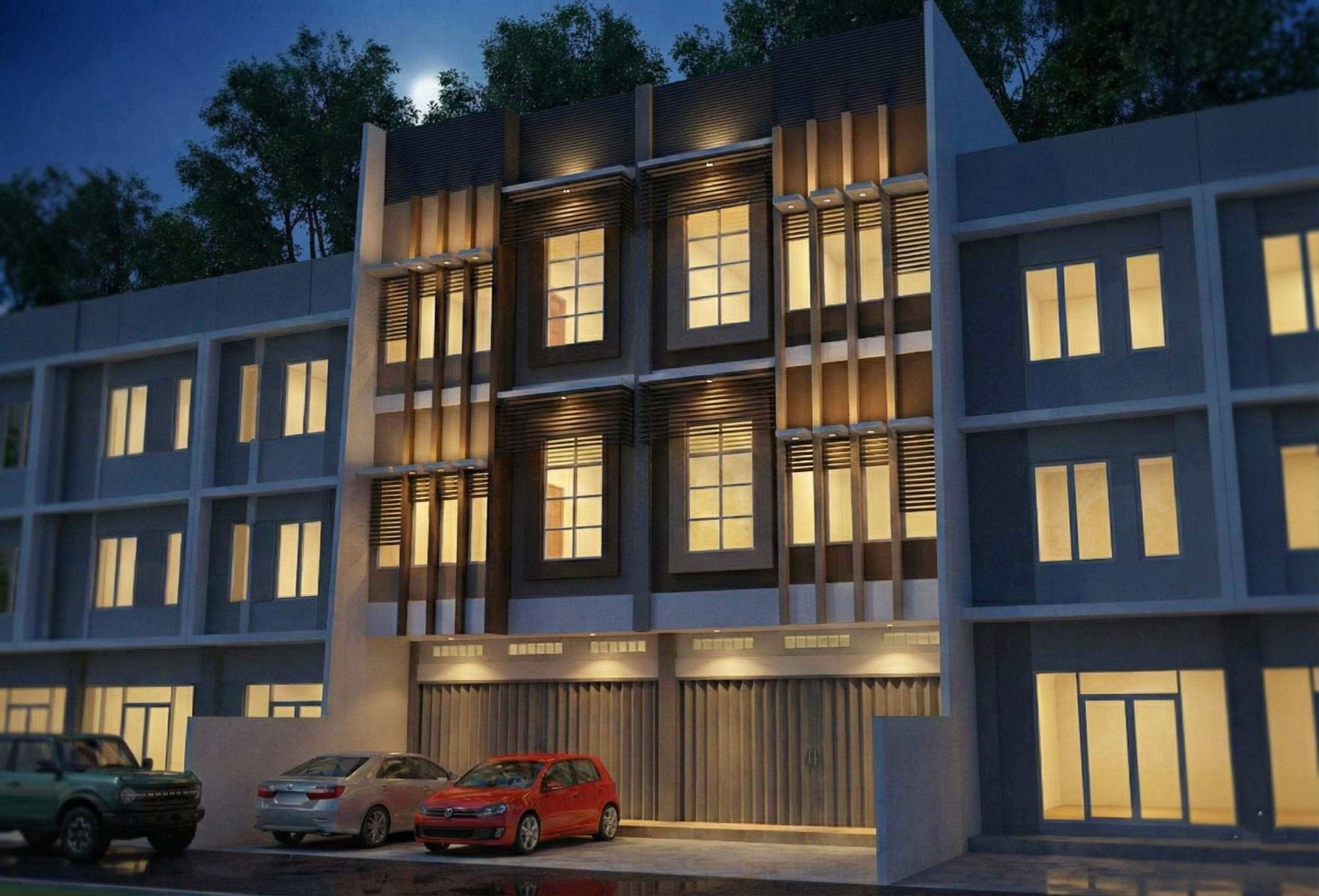 Konsep bangunan pada gambar tersebut mengusung pendekatan Modern Minimalis dengan komposisi fasad yang kuat dan ritmis. Permainan elemen vertikal berupa kisi-kisi dan frame tebal pada area jendela menciptakan kedalaman visual sekaligus berfungsi sebagai shading untuk mereduksi panas matahari langsung. Dominasi warna netral yang dipadukan dengan aksen cokelat kayu memberikan kesan hangat dan elegan